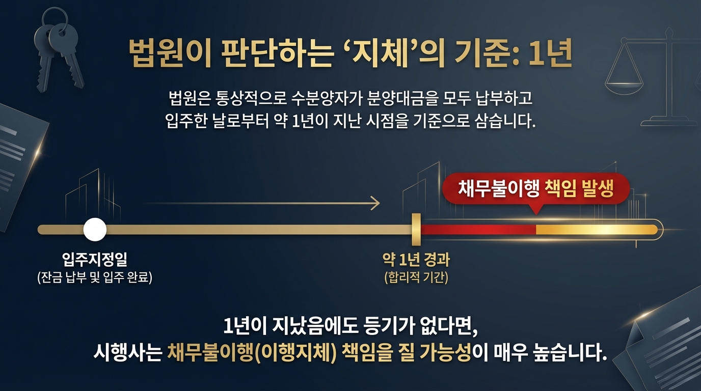 법원은 통상적으로 수분양자가 분양대금을 모두 납부하고 입주한 날(입주지정일)로부터 약 1년이 지난 시점을 그 기준으로 삼고 있습니다. 따라서 입주 후 1년이 지났음에도 등기가 나오지 않았다면, 시행사는 채무불이행(이행지체) 책임을 질 가능성이 매우 높습니다.