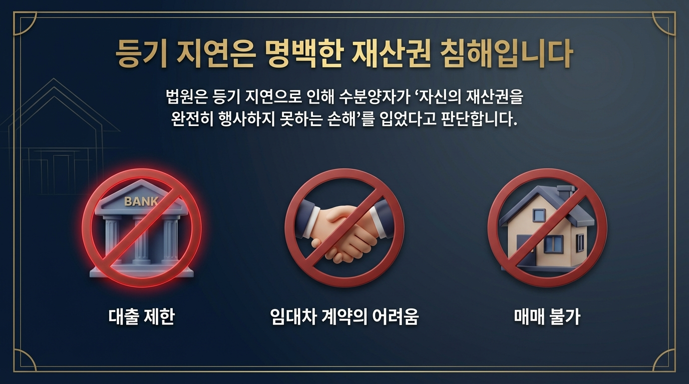 법원은 등기 지연으로 인해 수분양자가 ‘자신의 재산권을 완전히 행사하지 못하는 손해’가 발생했다고 봅니다.