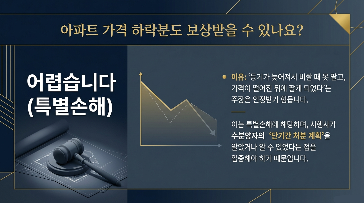 반면, 아파트 가격 하락으로 인한 매도 차익 손실“등기가 제때 나왔더라면 아파트 가격이 높을 때 팔 수 있었는데, 등기 지연 때문에 가격이 떨어진 후에야 팔게 되어 손해를 봤다”는 주장은 법원에서 받아들여지기 어렵습니다.