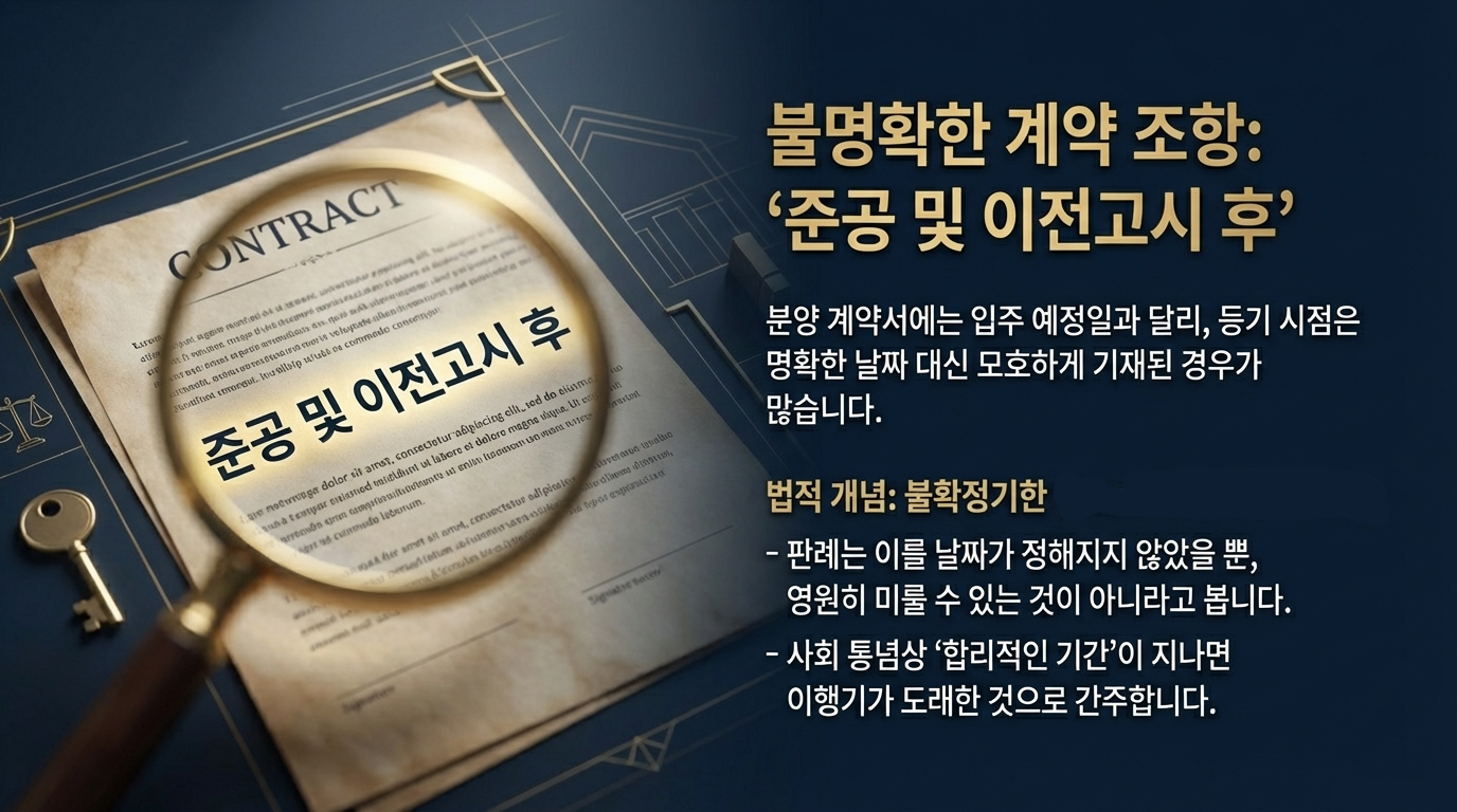분양 계약서에는 보통 입주 예정일은 명시되어 있어도, 소유권이전등기 시점은 "준공 및 이전고시 후"와 같이 불명확하게 기재된 경우가 많습니다.