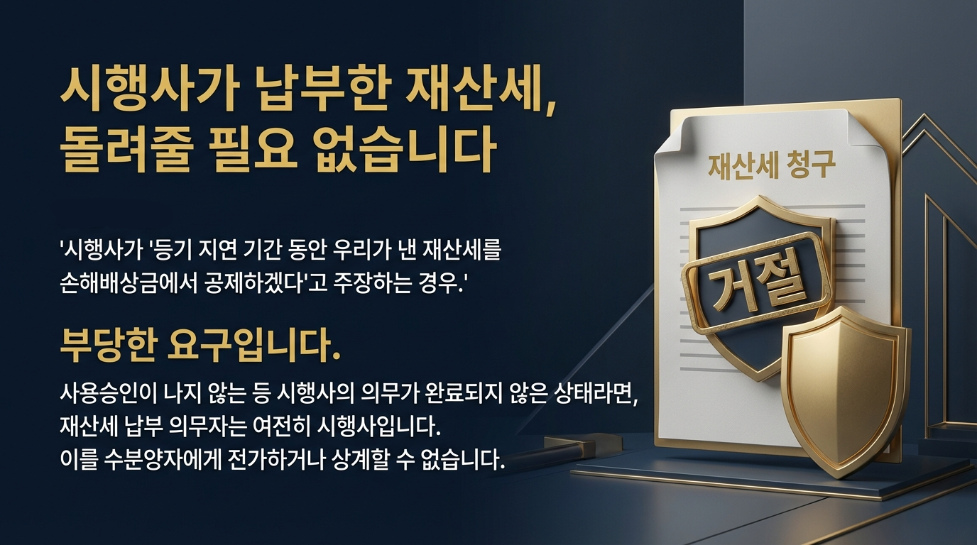 하지만 법원은 사용승인이 나지 않는 등 시행사의 의무가 완료되지 않은 상태라면 재산세 납부 의무자는 여전히 시행사이며, 수분양자에게 이를 전가할 수 없다고 판단하고 있습니다.